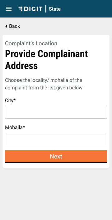 Select the City and the Locality/Mohalla from the drop-down list. Mohalla details are available for the selected city.