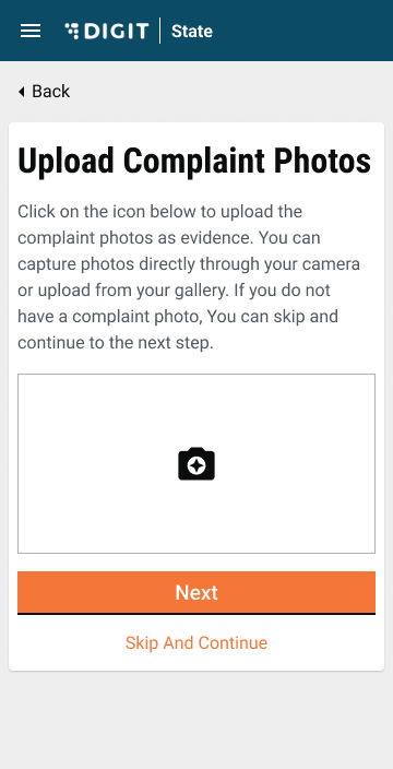 Upload a photo as evidence. Use the camera icon to click pictures and upload them directly. Click on Skip and Continue if you do not want to upload any photos.