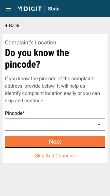 Enter the Pincode to indicate the location of the complaint. Click on Skip and Continue to proceed in case you do not have the PIN details.