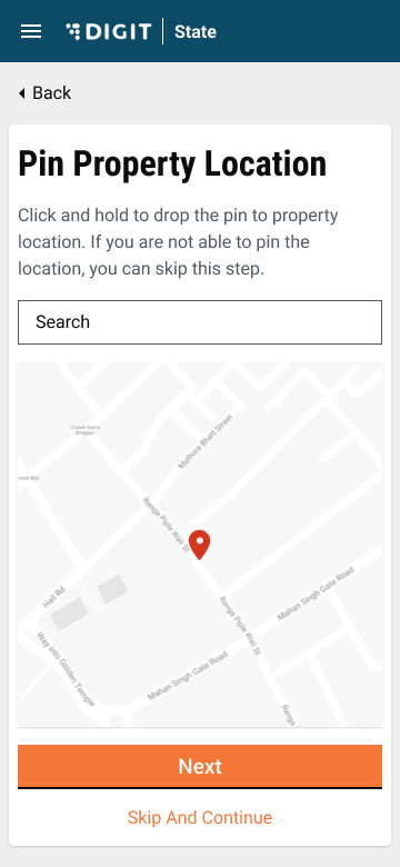 Move the pin to the property location on the given map. Skip And Continue in case this is not available.