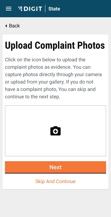 Upload a photo as evidence. Use the camera icon to click pictures and upload them directly. Click on Skip and Continue if you do not want to upload any photos.