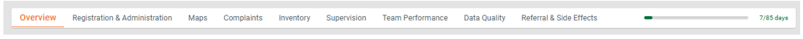 The dashboard is divided into several tabs based on campaign modules: Registration & Delivery, Inventory, Complaints, Supervision, Team Performance, Data Quality, and Referral and Side Effects.