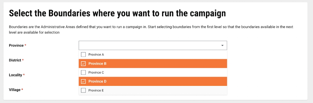 On the My Campaign screen, click the Actions button and then select Edit Campaign Boundary Data from the dropdown. Add existing boundaries from the dropdown.