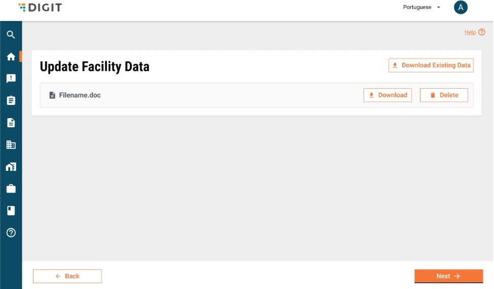 On the Update Facility Data Screen, click on the "Download Existing Data" button to download the last successfully uploaded file used for creating the Facility Data. Open the downloaded file and review the existing facility data.