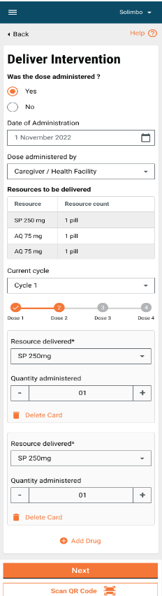 Navigate to the Deliver Intervention screen. This screen is configured based on the selected campaign type. The system automatically displays the list of resources and their quantities based on the intervention plan. These values are pre-filled in the form.