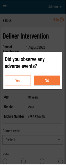 Click on the Next button - a pop-up appears with the question: “Did you observe any adverse events?”
