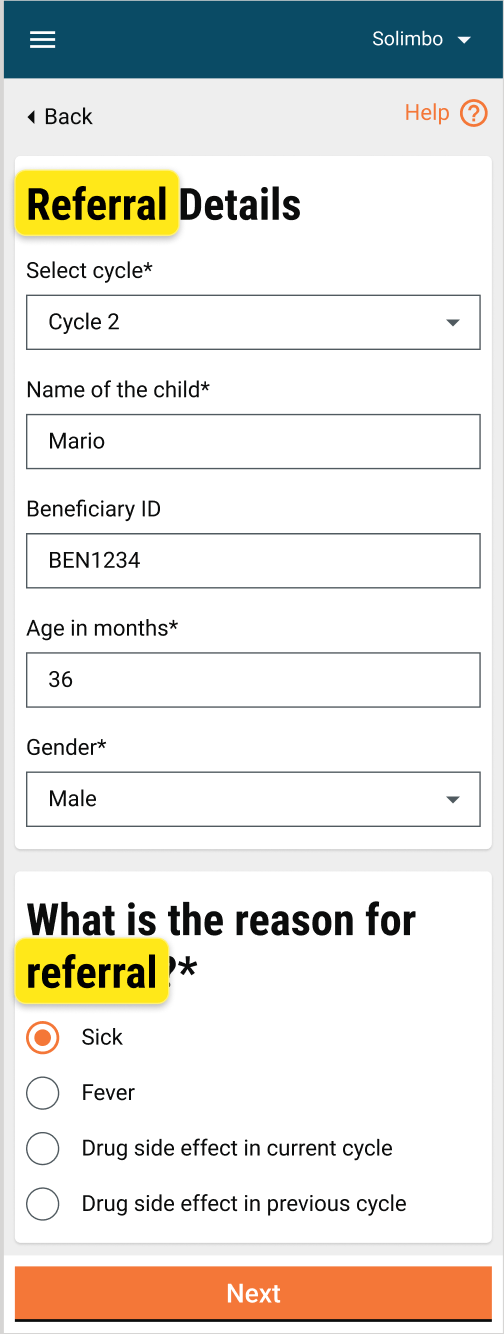Name of the child: The user needs to add the name of the referred beneficiary. This field is mandatory.
