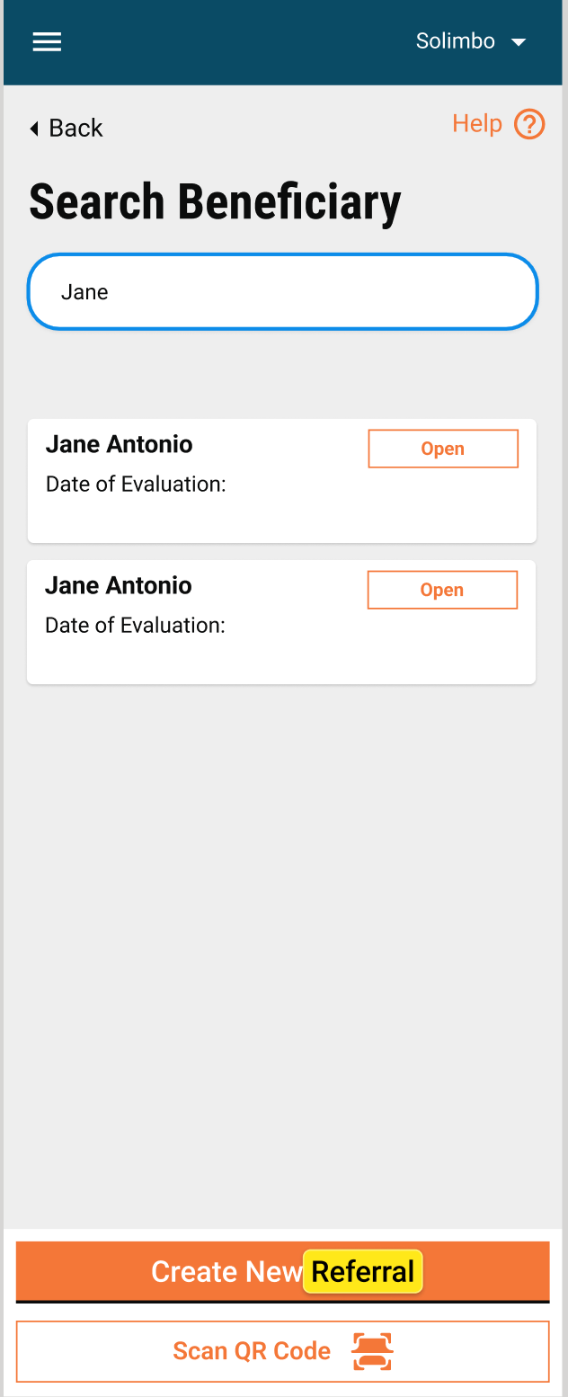 Click on the Create New Referral button to add a new entry in the Referral module, in case the beneficiary is available in the search.