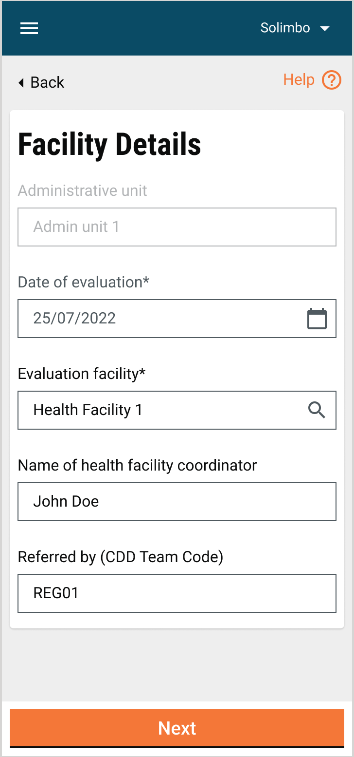 Evaluation Facility: This will be a mandatory field for the health facility worker to search and add. It is the ID used for a given health facility.