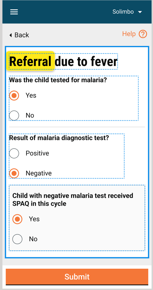 If the user chooses “Negative” for “Result of Malaria Diagnostic Test?, following questions are displayed: