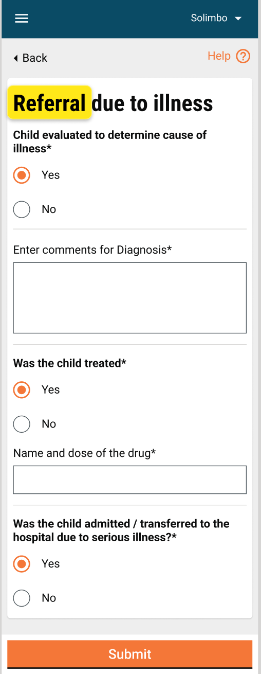 Child evaluated to determine cause of illness: This will be a mandatory question to be answered with 2 options in the form of a radio button: Yes or No.