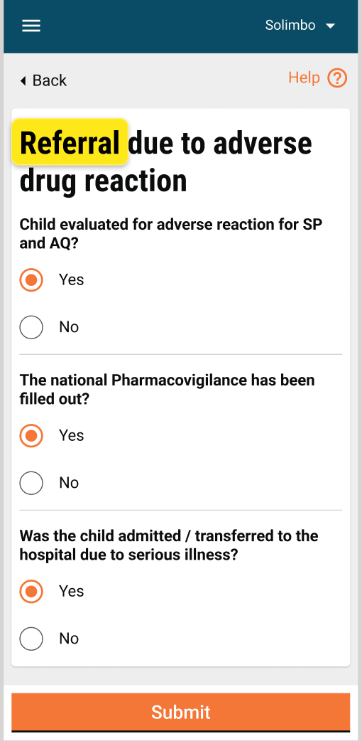If “Drug side effect in current/previous cycle” was chosen as a reason: If the user selects “Drug side effect in current/previous cycle” as the reason, the“Referral due to adverse drug reaction” screen appears with the following questions: