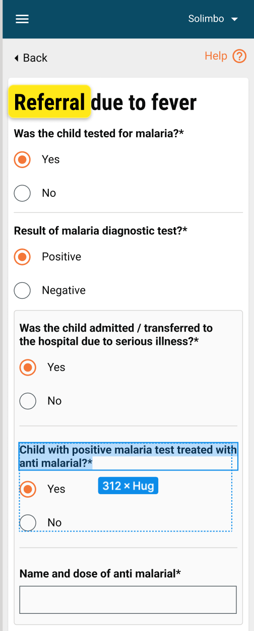 Result of Malaria Diagnostic Test?: This is a mandatory field, and based on the response to this question, the next set of questions opens up as a nested form.