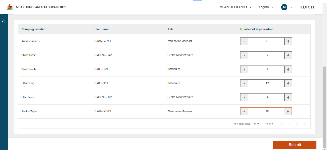 Next, the "Edit Attendance" page is displayed, which will allow the proximity supervisor to update the attendance data for each field supervisor with the help of the ‘+/-’ buttons, or they can enter the count directly within the data entry field. The ‘Submit’ button is disabled until the proximity supervisor updates the attendance for at least one field supervisor.