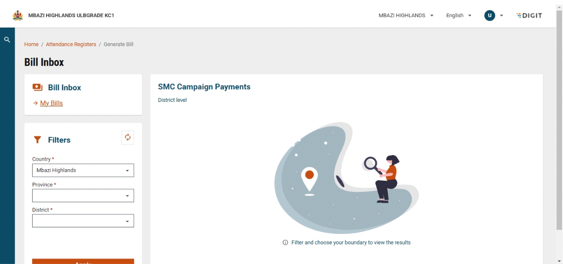 Following the selection of the project name, you will be navigated to the ‘Inbox’ screen, where, by default, no attendance registers are shown. To view attendance registers, a desired boundary must be selected through a boundary filter (in this case, ‘District’). Once the desired boundary is selected, click on ‘Apply’ to proceed.