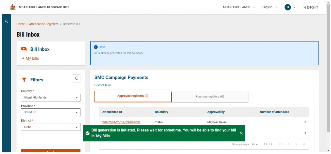 Following this, the "Bill Inbox" page will appear, where the specific boundary should be filtered for which the bill has to be generated. Once selected, it will display all the attendance registers, both approved and pending approval, which can be only viewed by the campaign supervisor, along with an option to generate the bill. Click on "Generate Bill".