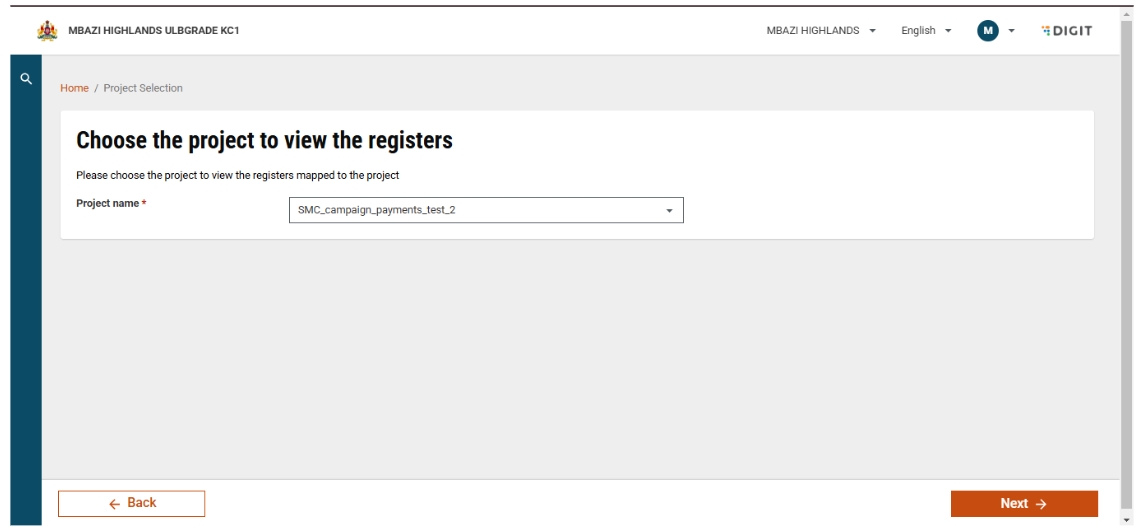 On this page, the project name (event type name) from the available options must be selected, as well as the aggregation boundary details, whether the bill should be aggregated at the national, province/state, or district level. Select the required aggregation boundary level and click on ‘Next’.