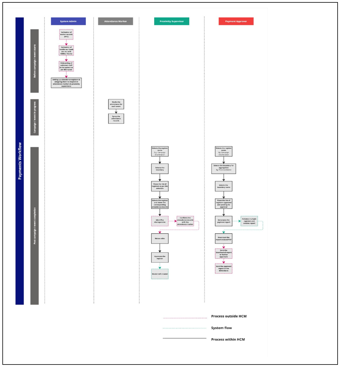 Payment Approver: Oversees the consolidation of attendance records to generate boundary-specific reports. They are responsible for approving the payment report, forwarding it to higher operations for additional approvals, and liaising with financial institutions to process payments.
