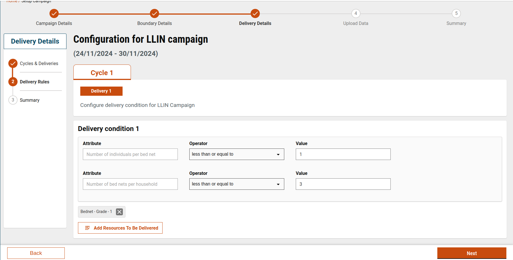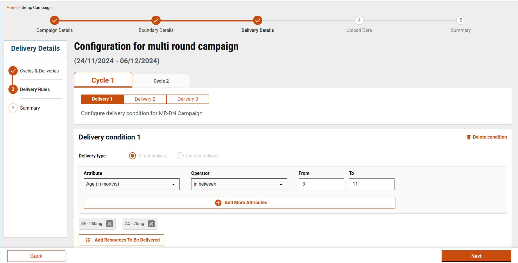 The Delivery Details step allows users to define when, to whom, and what resources are delivered during a campaign. This configuration is completed across three screens: