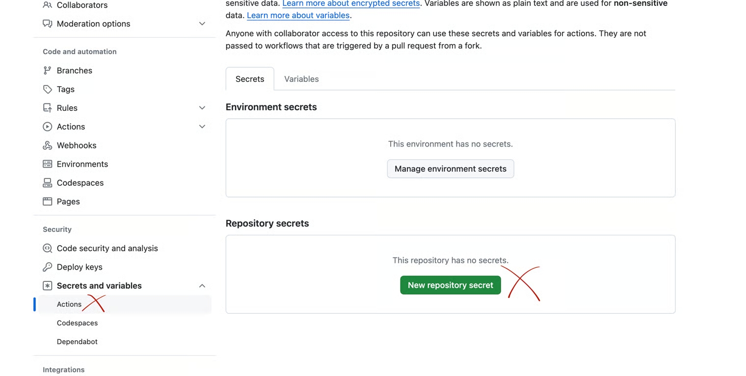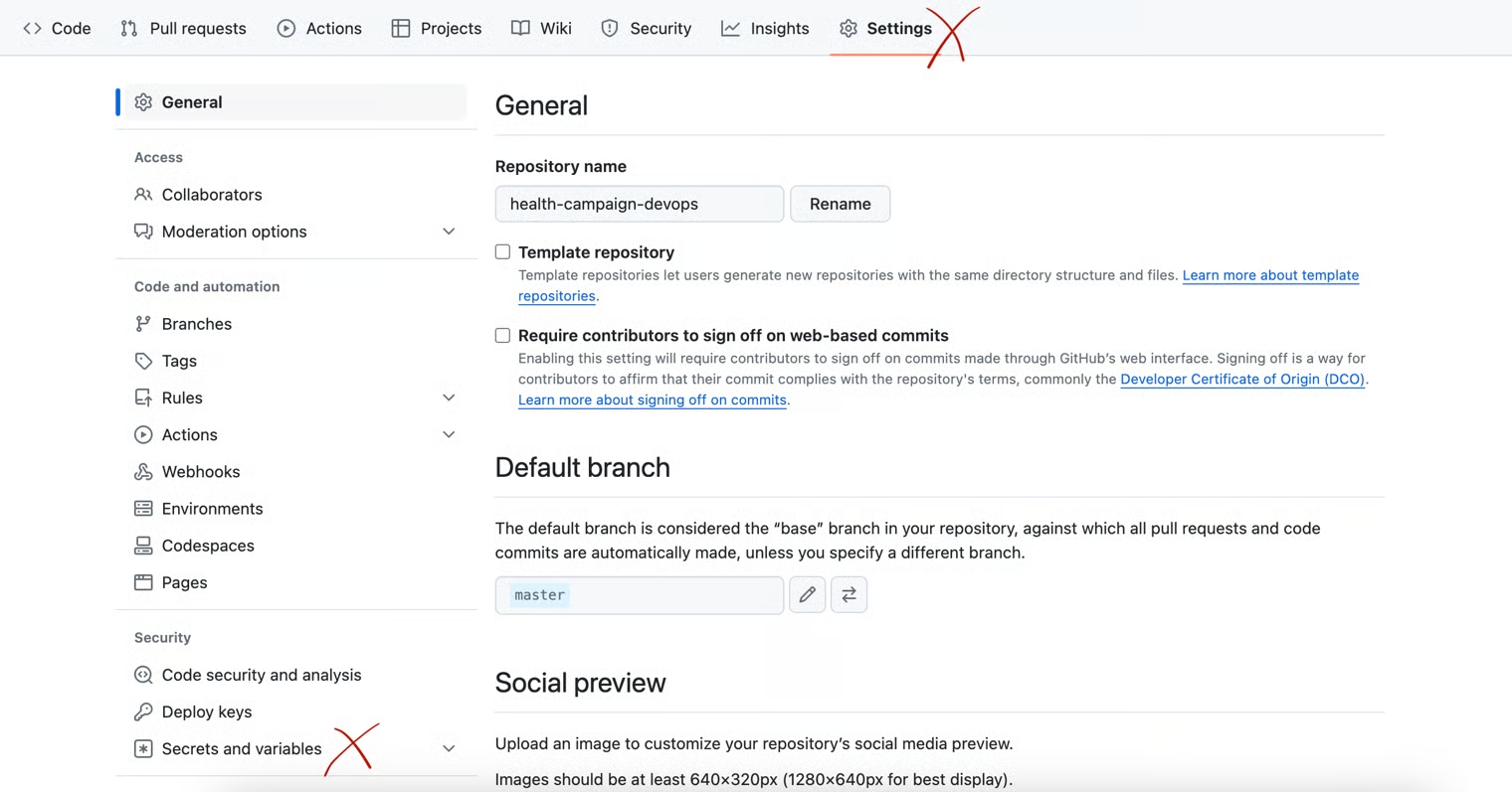 Go to the forked health-campaign-devops repository and navigate to the repository settings.