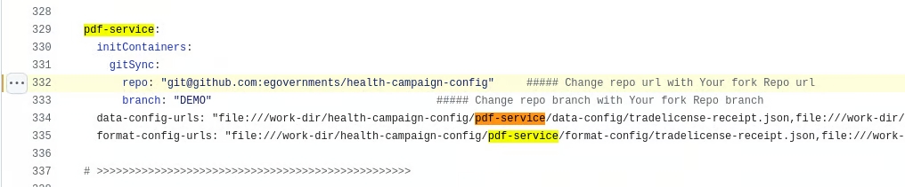 Under the pdf-service: change the git-sync link of the health-campaign-config repository to the forked config repository and the branch to DEMO.