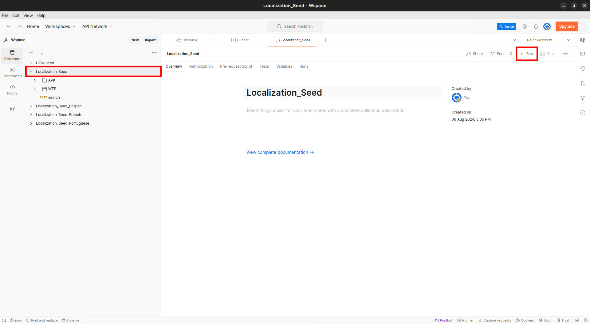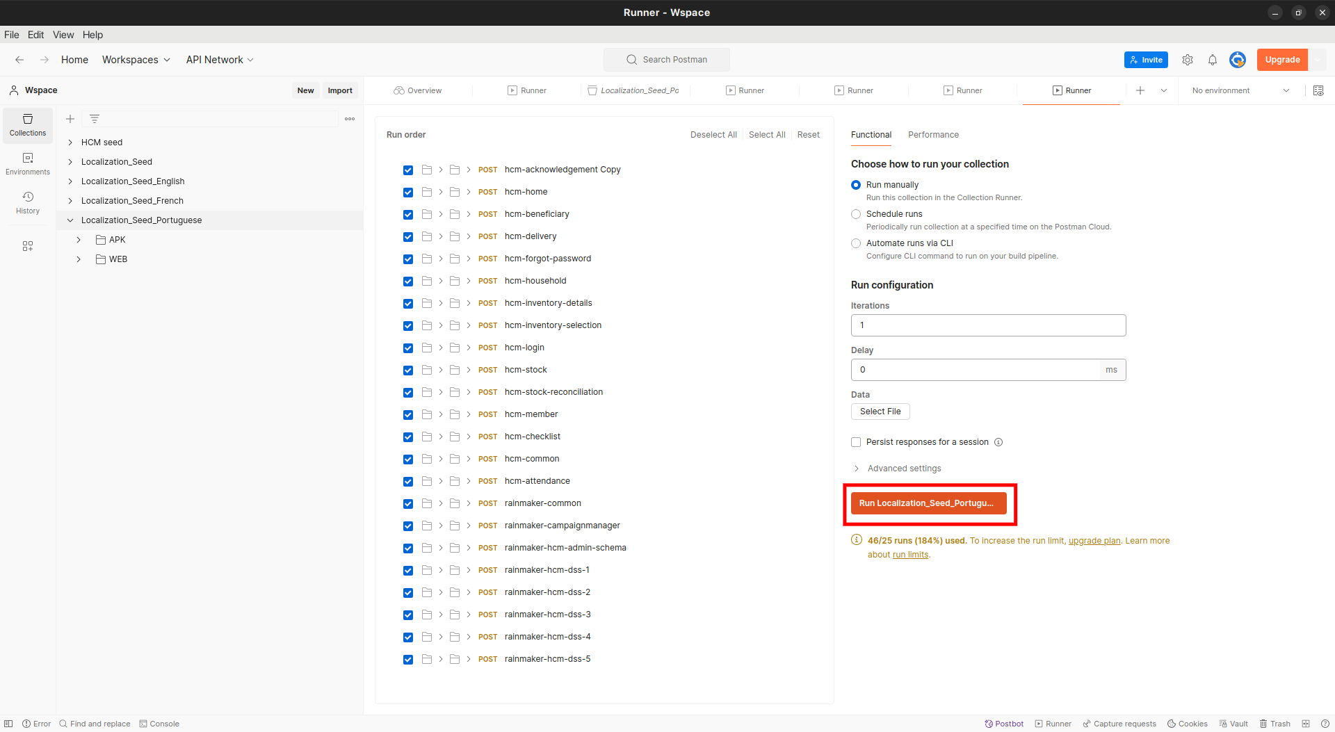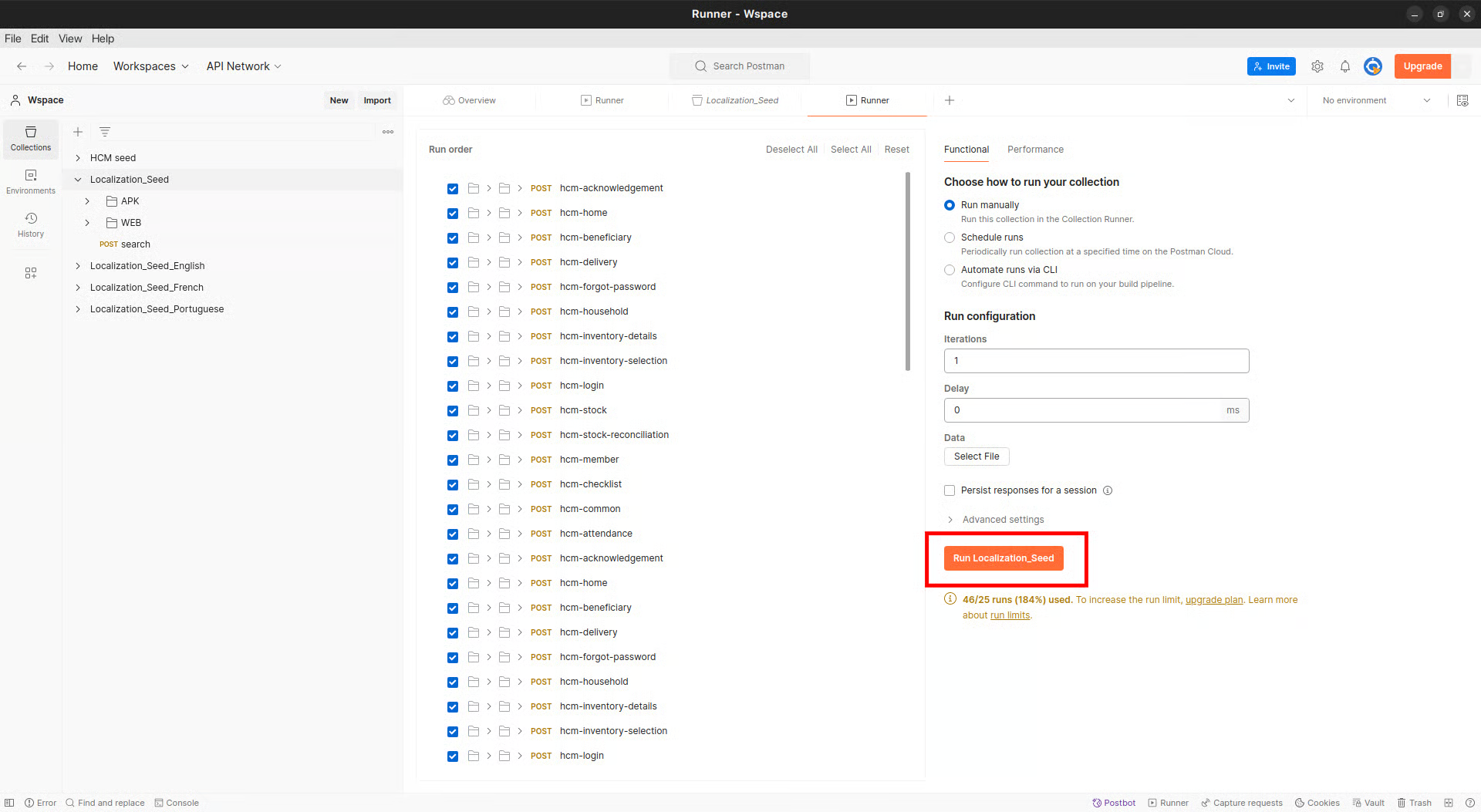Import the downloaded file into Postman, select all language localisation collections, and click on run. See the screenshot below for reference:
