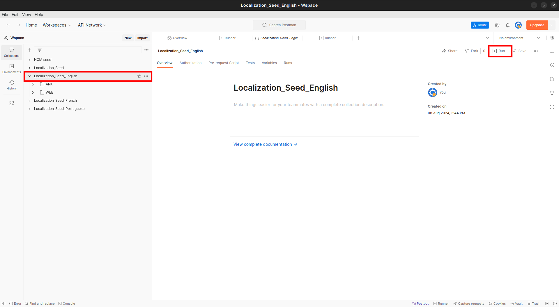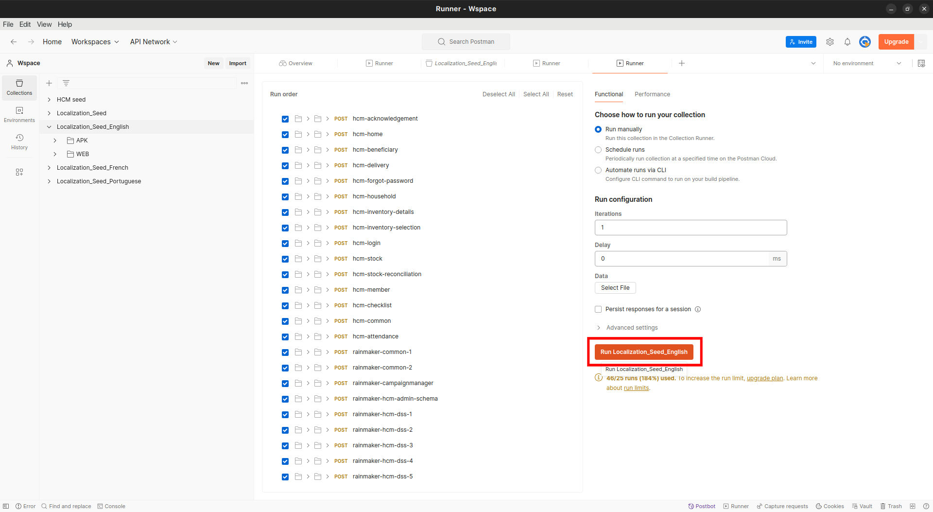 Import the downloaded file into Postman, select the English collection, and click on run. See the screenshot below for reference:
