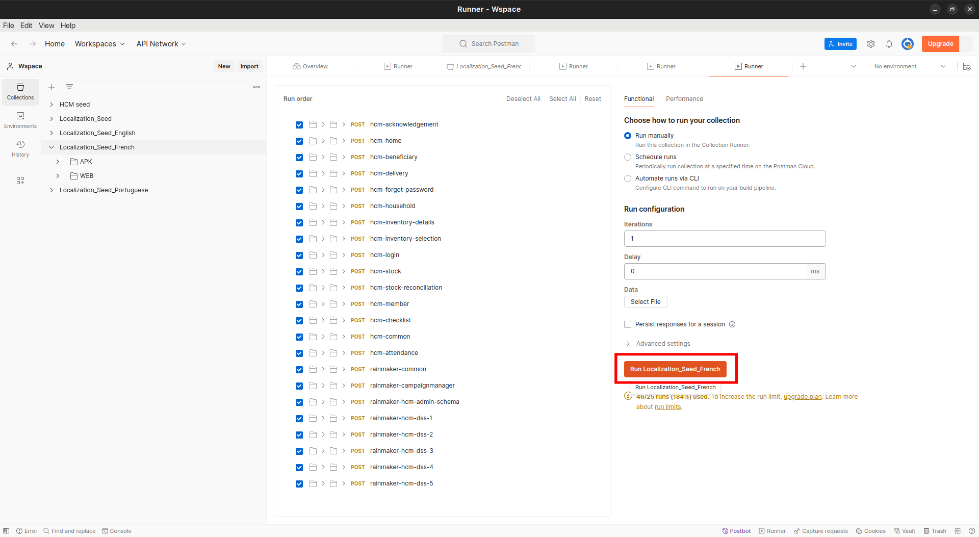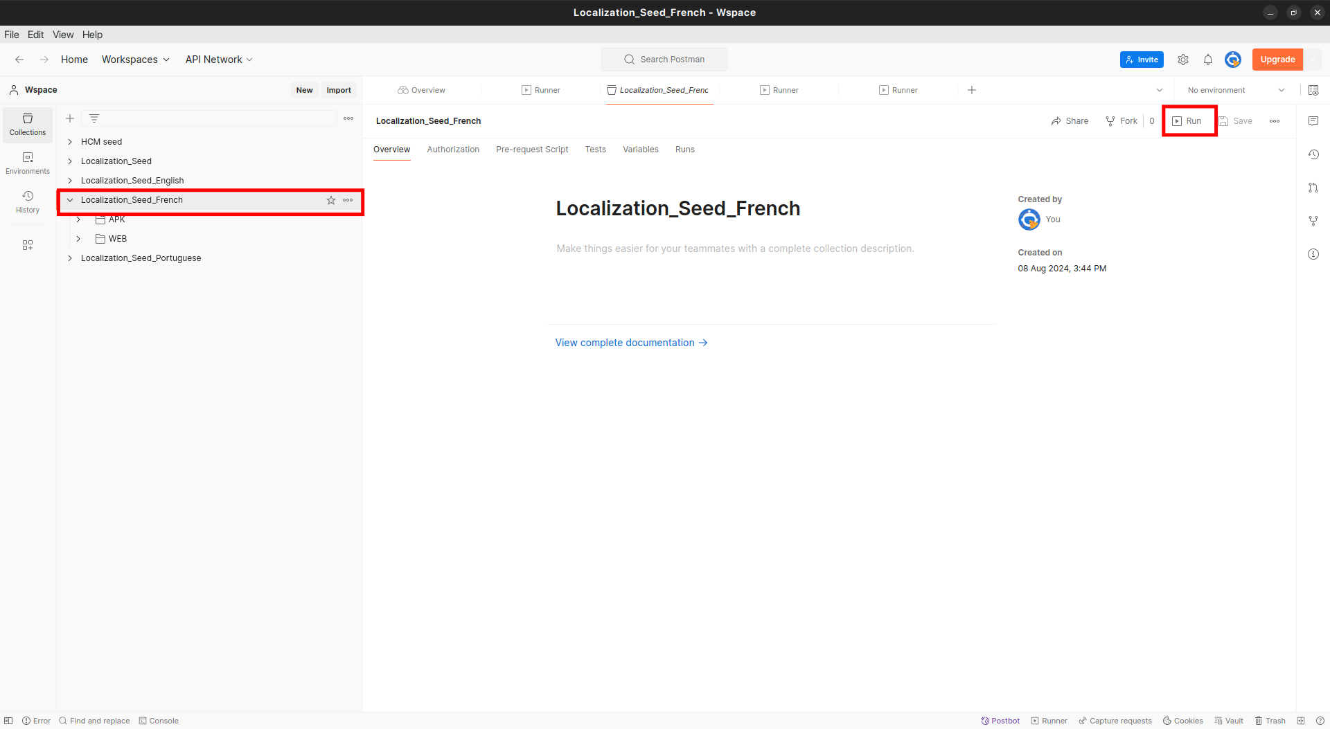 Import the downloaded file into Postman, select the French collection, and click on run. See the screenshot below for reference: