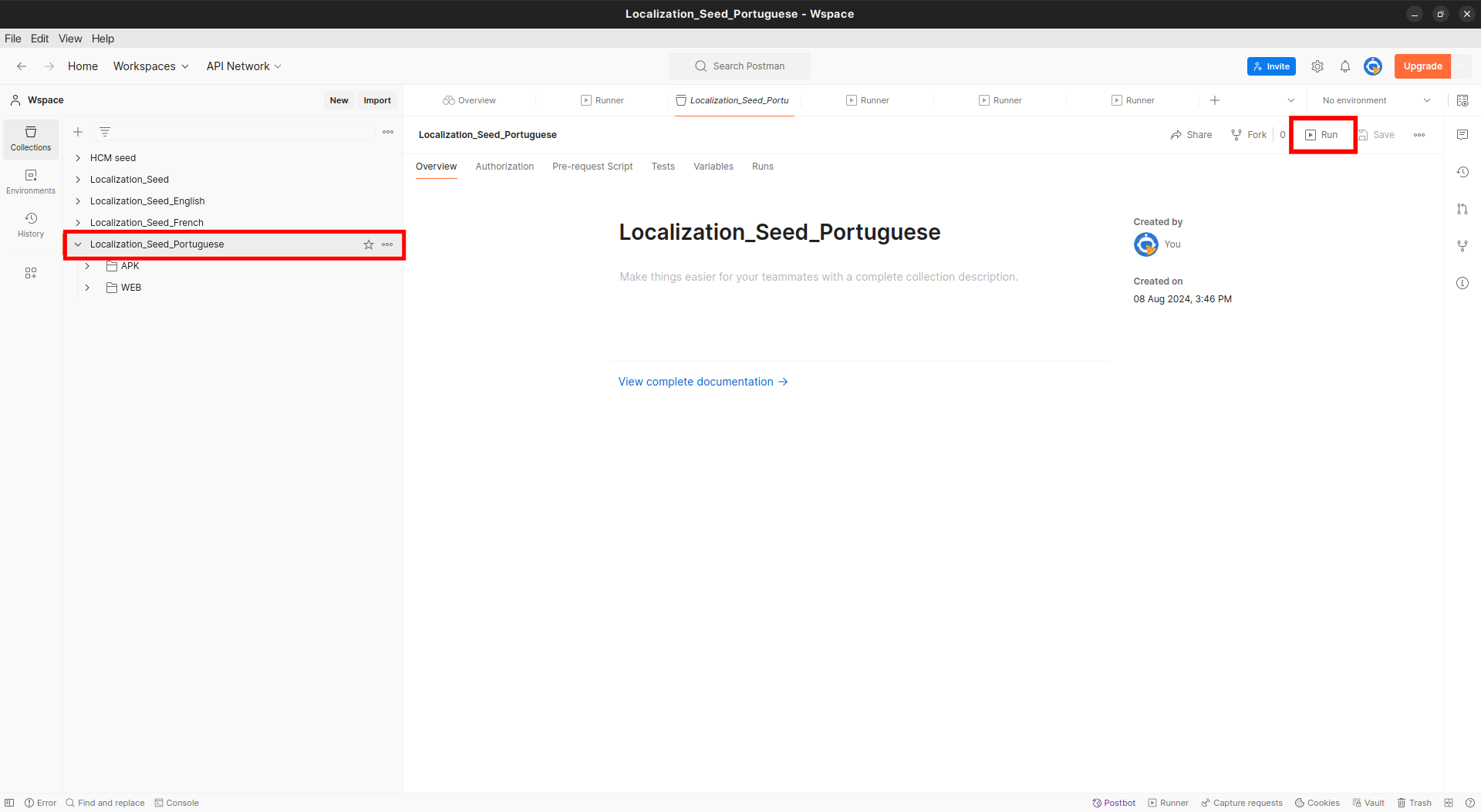 Import the downloaded file into Postman, select the Portuguese collection, and click on run. See the screenshot below for reference: