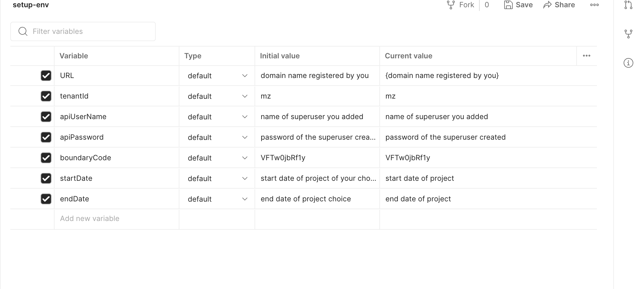 Click on New > Environment and add the following variables: