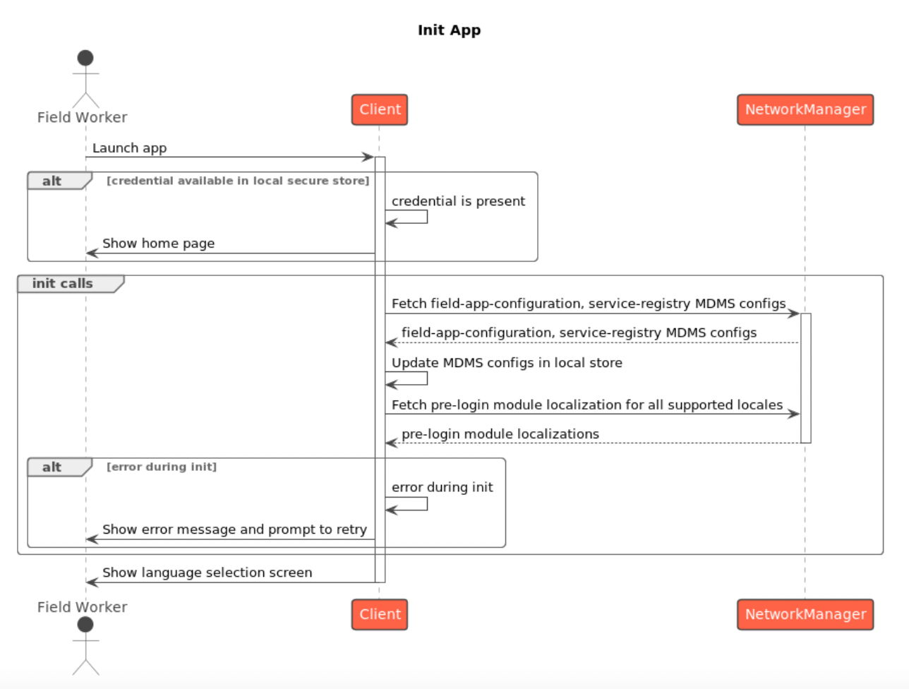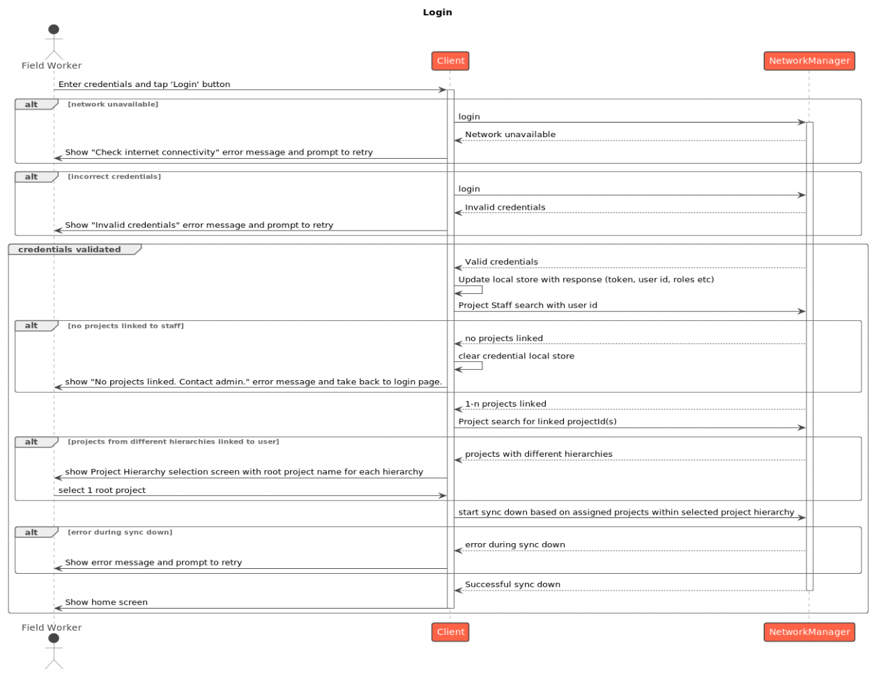 These functionalities are collectively called sync. The retrieval of configuration and data is referred to as sync down while sending data collected using the app is called sync up. Login and sync can only be done while the user is online.