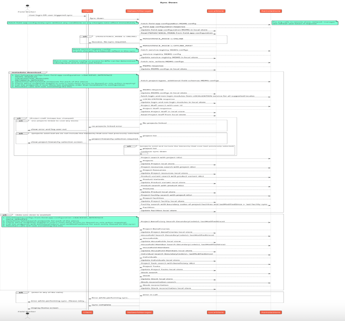 When a user logs in, a sync down is performed to fetch the required configuration and data for the field app to run. After collecting data using the app, the user can perform a sync, which will perform a sync-up (to send all data collected) followed by a sync-down (to retrieve any fresh configuration). Syncing of data down is not required for the initial implementation and can be turned off.