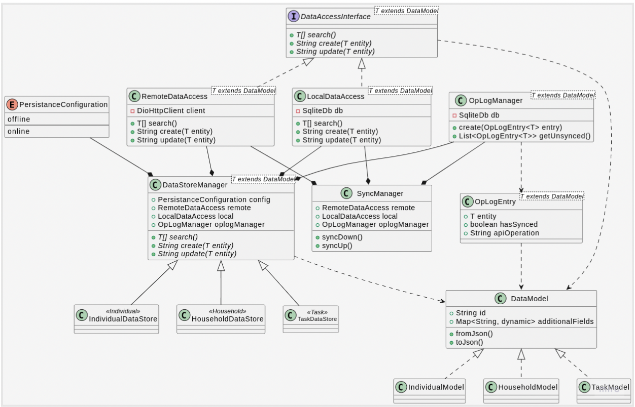The network manager component in the app acts as an interface between the rest of the app and the backend. As a result, the other components in the app do not have to change their behaviour based on whether the app is online or offline and rely on the network manager to handle this complexity. This implies that the network manager makes an API call directly if the app is offline or saves to the local database and the op log if the device is offline, whereas the other components just make a call to the network manager to read/write data.