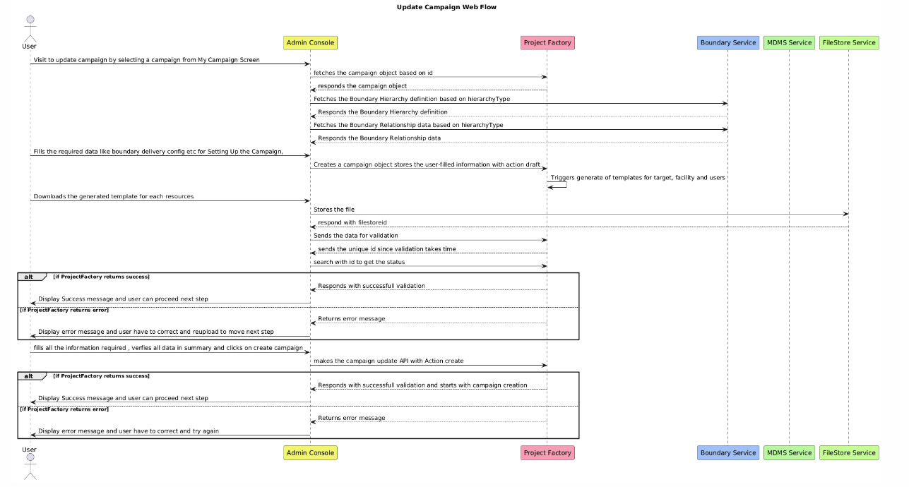 This document outlines the flow for updating an existing campaign using the Admin Console. The structured sequence ensures that any changes to the campaign are thoroughly validated and processed, minimising errors and ensuring the integrity of the campaign data. By following this flow, users can confidently update campaigns, knowing that all necessary steps are taken to verify and finalise their changes.