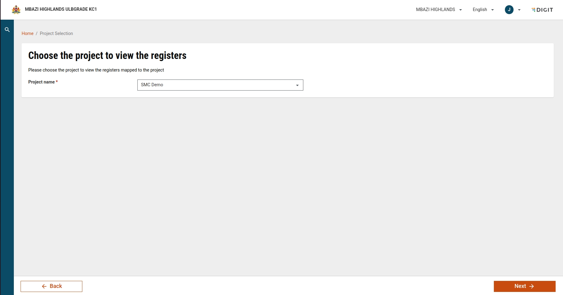 Proceed to Next Screen: Click "Next" to access the registers associated with the project.