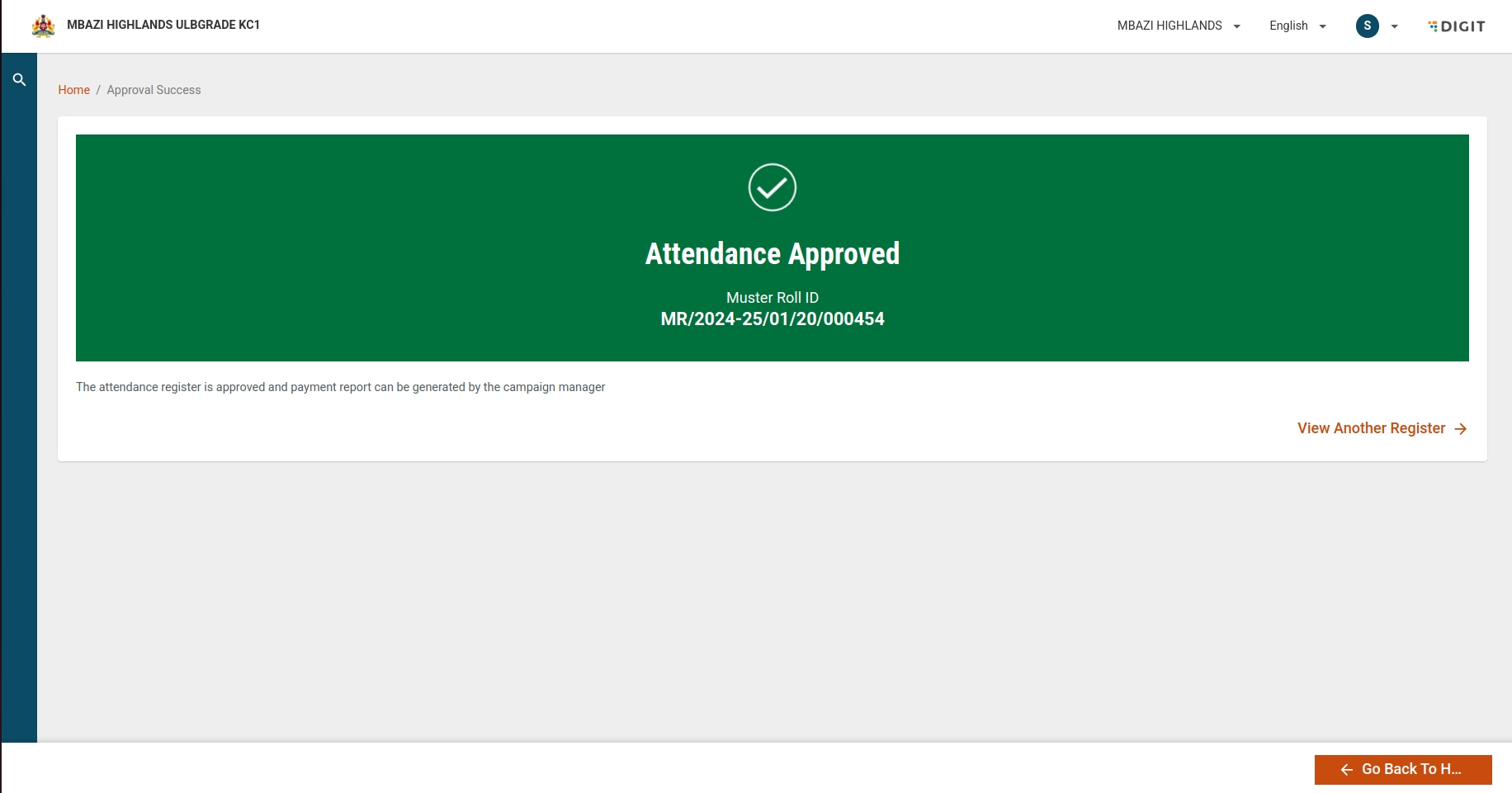 Clicking on any register ID from the inbox displays detailed information about the attendance register. The screen includes information such as campaign details, attendance officer details, and attendee information. Users can perform two primary actions: Edit and Approve.