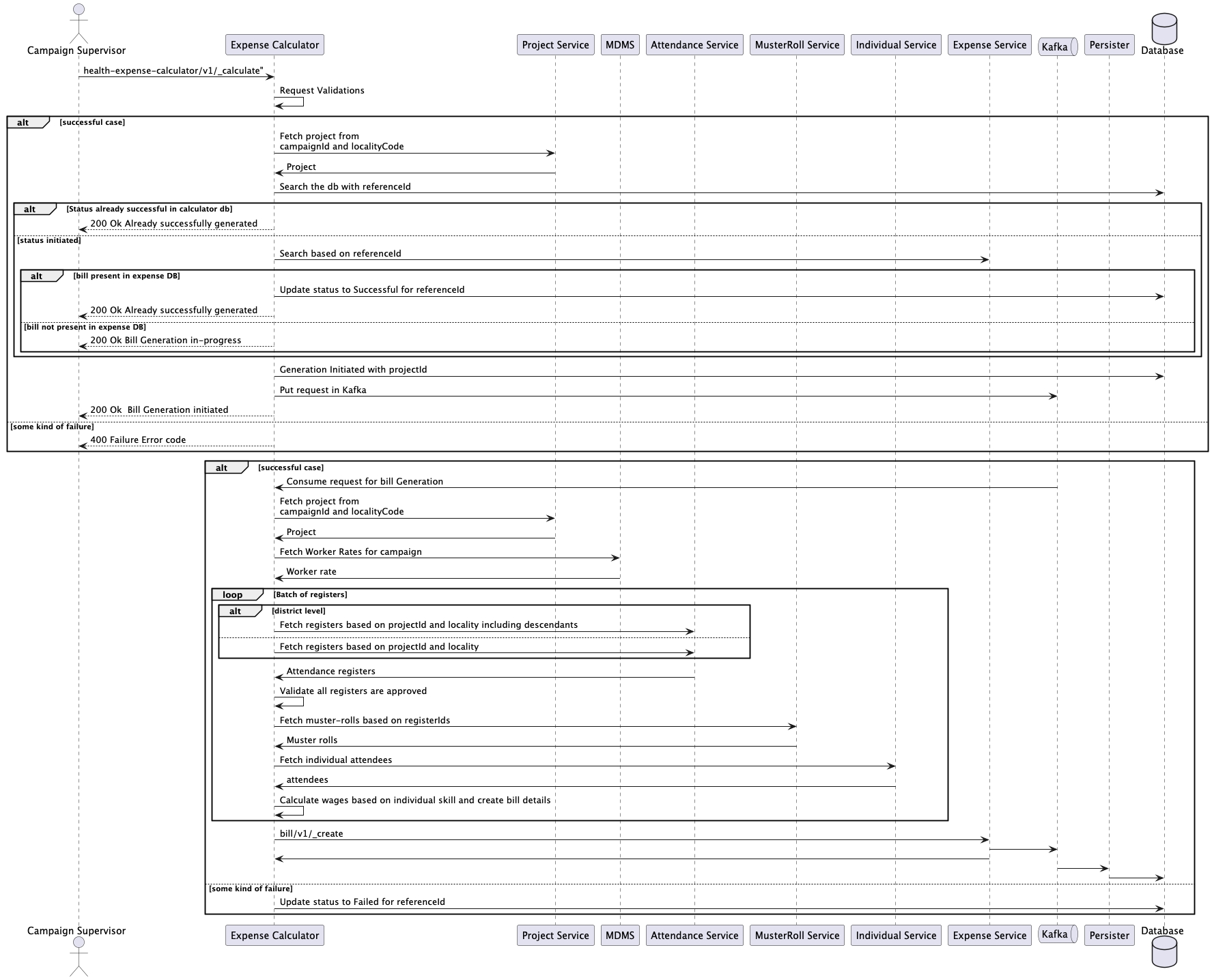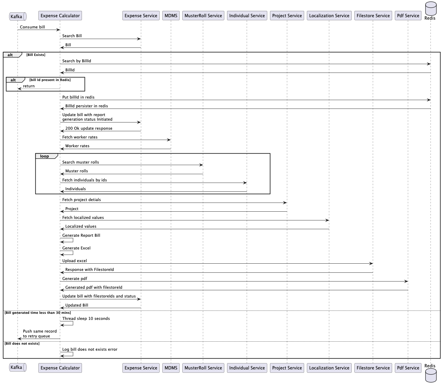 The expense calculator is an implementation-specific service that works in tandem with the expense service. This service holds all the specific business logic for computing expenses and calls the billing service with the correct payload to create a bill. Once the bill is generated, Excel and PDF are generated by the calculator service.