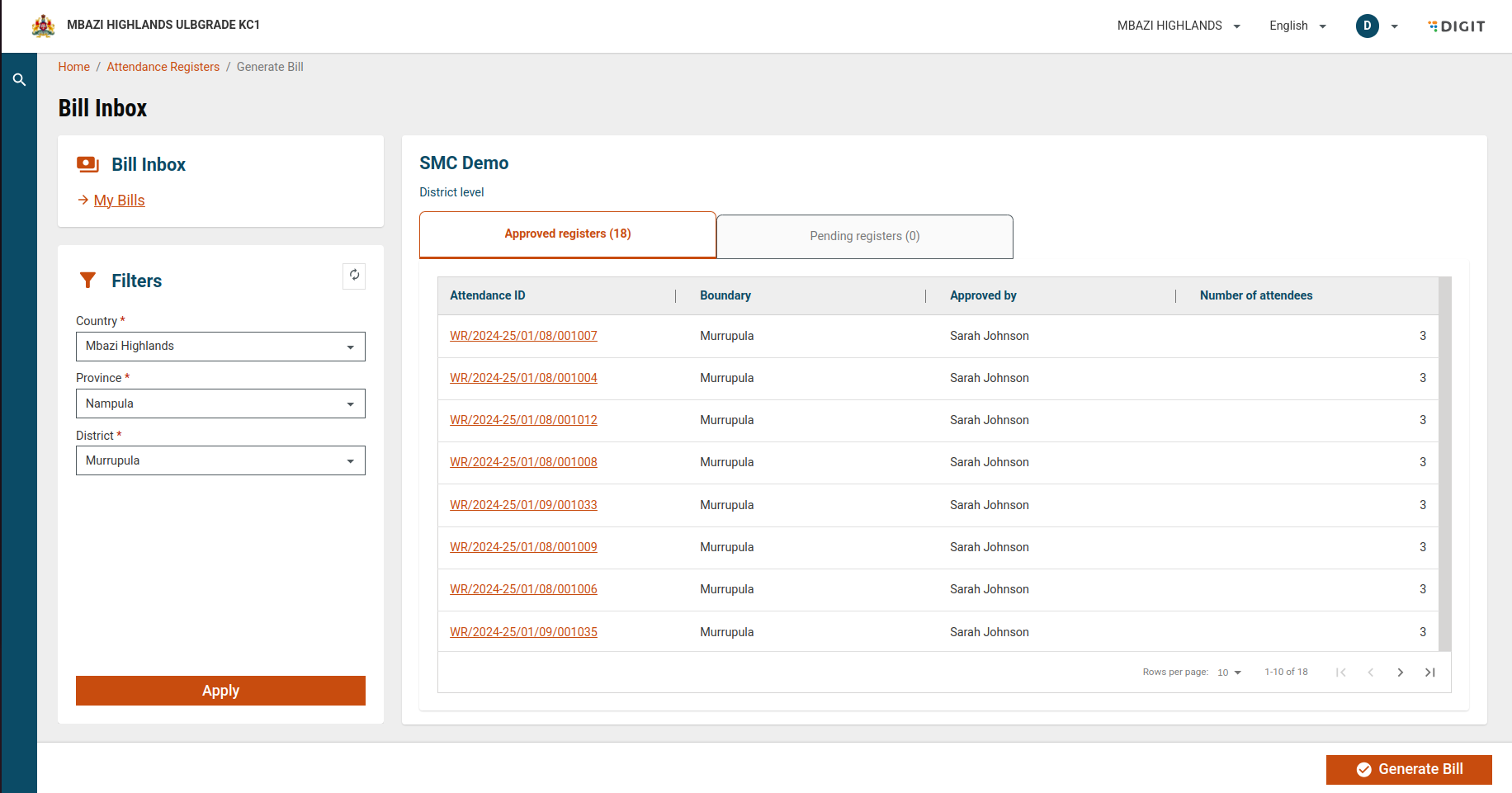 The Generate Bill button is enabled only if all the registers within the selected boundary are approved and the bill has not been generated already.