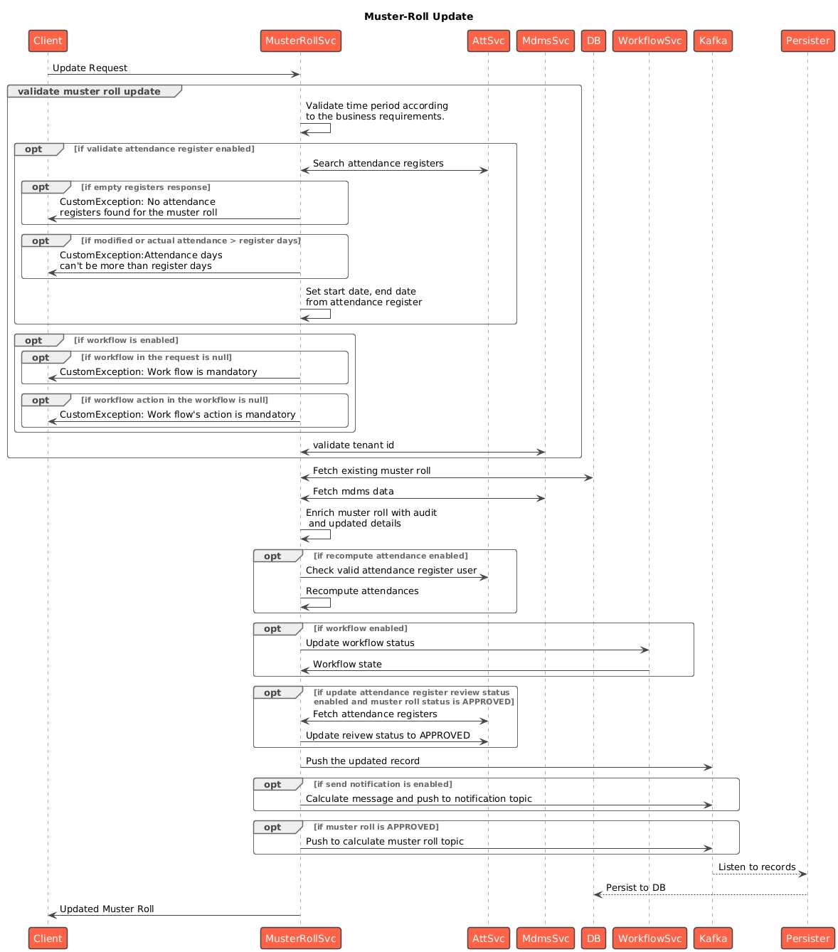 The Muster Roll service aggregates attendance logs from the attendance service based on some rules and presents an attendance aggregate for a time period (week or month) per individual. This can then be used to compute payments or other semantics.
