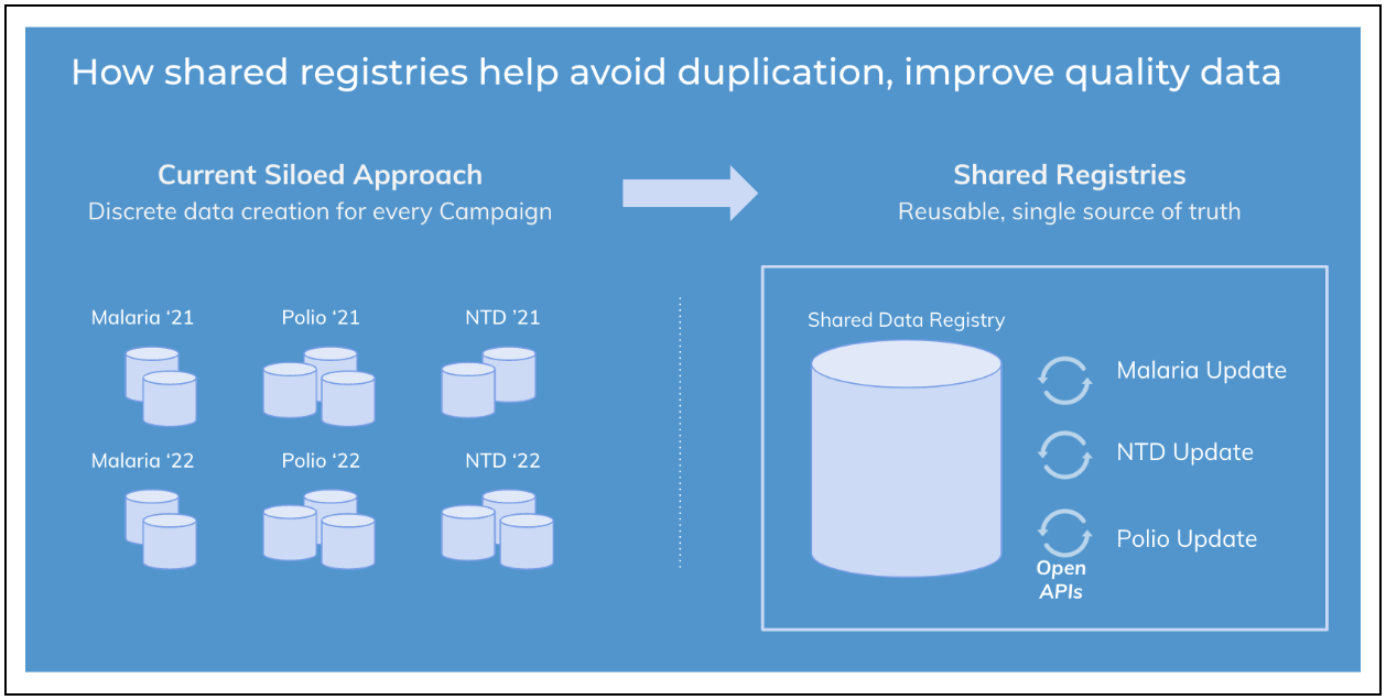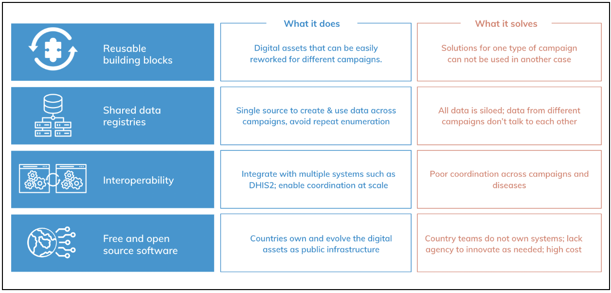 With these building blocks, one campaign could easily be pivoted to set up another health campaign. For example. a malaria campaign could be pivoted from a cholera campaign to an NTD campaign with minimal effort and time. Beyond campaigns, the same blocks could create solutions for routine health delivery and other health needs.