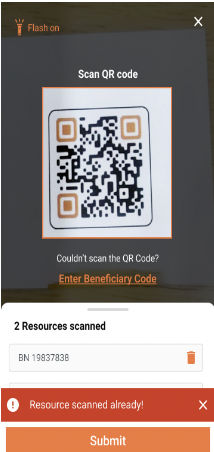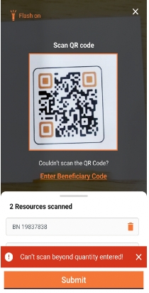 While delivering any resource to the beneficiary, the user must scan the code provided on the packaging of the resource. The scanner must be able to identify duplicate scans and must not scan the same voucher multiple times. The user can perform multiple scans at a time, but the number must not exceed the value provided by the user in the “Quantity Distributed” field.