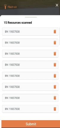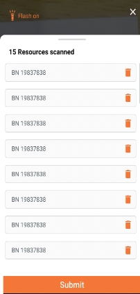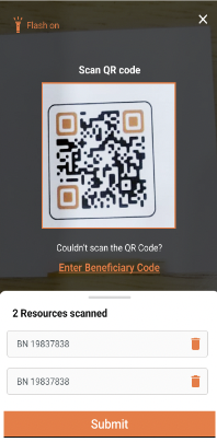 The scanner screen has an expandable card that provides the list of resources scanned. The card displays the count of resources scanned along with the identification number for each scanned resource. If one is unable to scan, the user can enter the codes manually, but after every code, he/she must click on the enter beneficiary code again and repeat the process. The user can remove any resource by the help of the delete button provided against each resource. Once scanned, the user must click on the submit button which brings him back to the deliver intervention screen. The toast message for successful scan is displayed on the screen.
