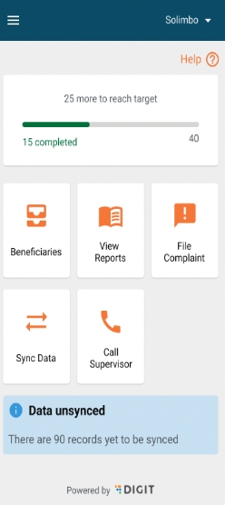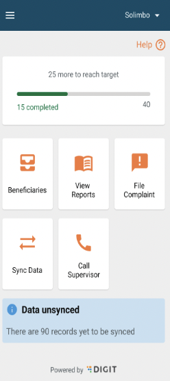 After logging into the application, the user lands on this screen which displays the daily performance (number of households registered). The progress bar must reset daily at 00:00 hours and start from 0 registrations. The action buttons related to the beneficiary include:
