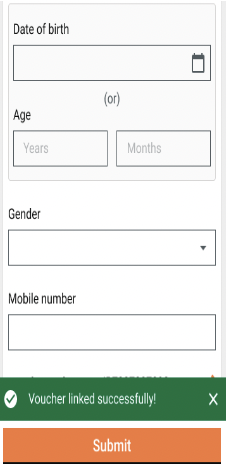 On successful scanning, the toast message appears over the individual details screen and the voucher code is displayed. In case the scanned code does not match with the one mentioned in the voucher, the user can click on the edit button and rescan or re-enter the code. The previously scanned value must be overwritten by the latest one (No multiple scanning to be done).