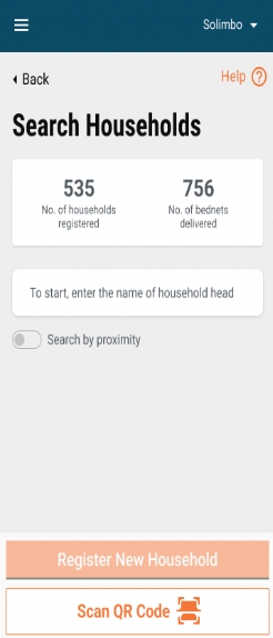 On this screen, a user can search for a registered beneficiary or register a new one. There are multiple options included to search for a beneficiary: search by name, proximity, and scan a code. The metrics card shows the data for beneficiaries registered and the number of resources delivered, depending on the type of campaign.