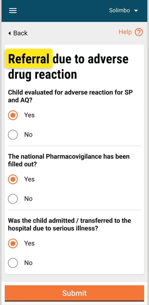Child evaluated for adverse reaction for SP and AQ?: This will be a simple Yes/No radio button in the form and it will not be a mandatory field.