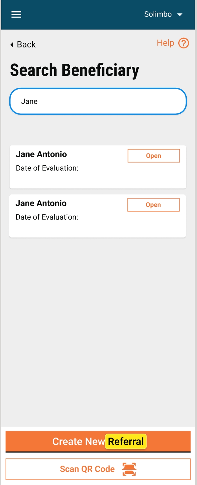 When the user clicks on the “Beneficiary Referral” button in the previous screen, the user will be taken to the “Search Beneficiary” screen where he/she can search for a given beneficiary by their name or a QR code voucher provided to the beneficiary.