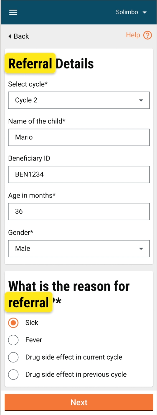 After selecting one of the reasons for referral, the user needs to press 'Next' which will navigate the user to 3 different screens based on what they select in the “Reason for Referral” section.