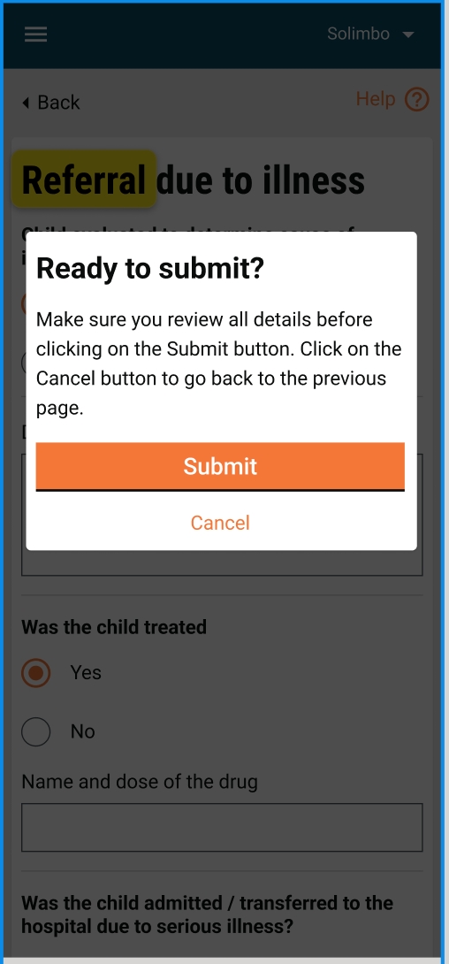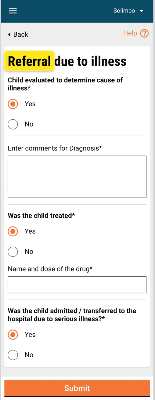 “Was the child tested for malaria?”: This question will have a Yes/No radio button option. This will be a mandatory field.