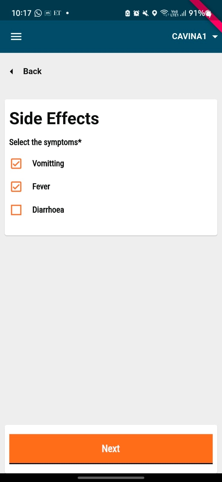You will be taken to the next screen where you need to record the side-effect experienced by the beneficiary. Once you have selected the relevant side-effect, click on 'Next'.